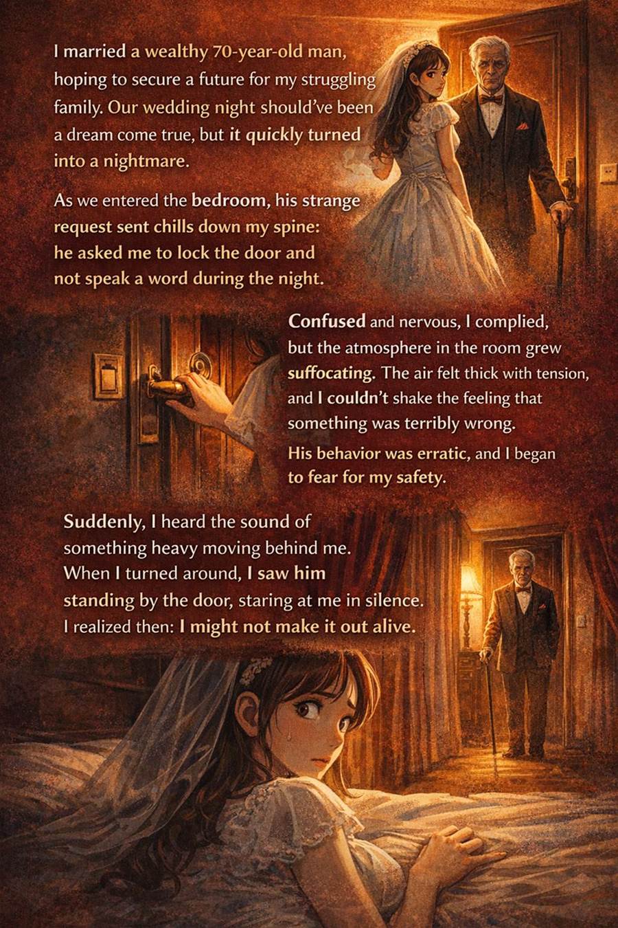 I married a wealthy 70-year-old man, hoping to secure a better future for my struggling family. It was supposed to be a dream come true—a marriage that would bring stability and comfort. But what should have been the happiest night of my life quickly turned into a nightmare.