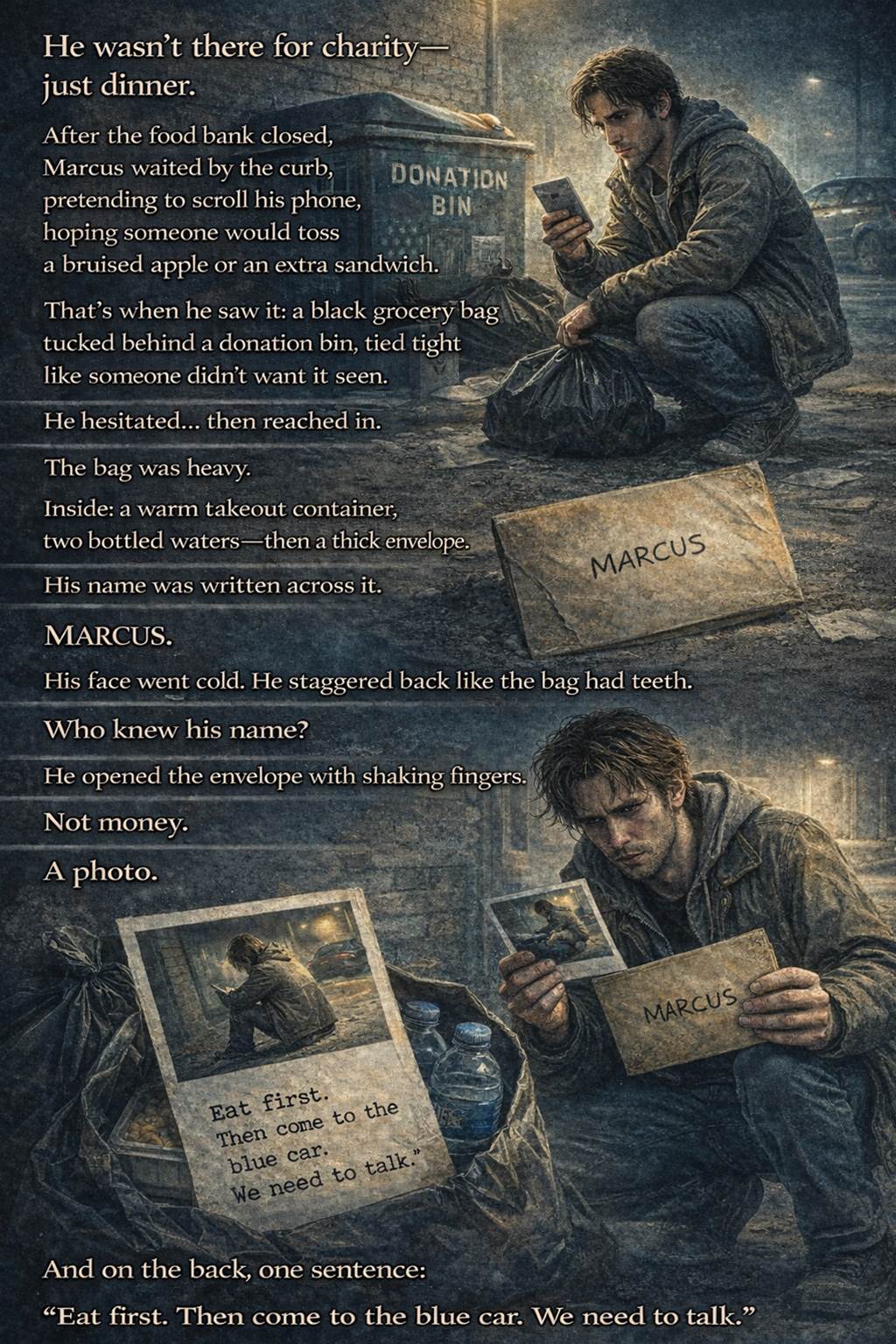 Marcus wasn’t there for charity—just dinner. He told himself that every night, because if he called it “charity,” he’d hear his own pride crack. So he waited after the food bank closed, standing near the curb, phone in hand, acting like he had somewhere to be.